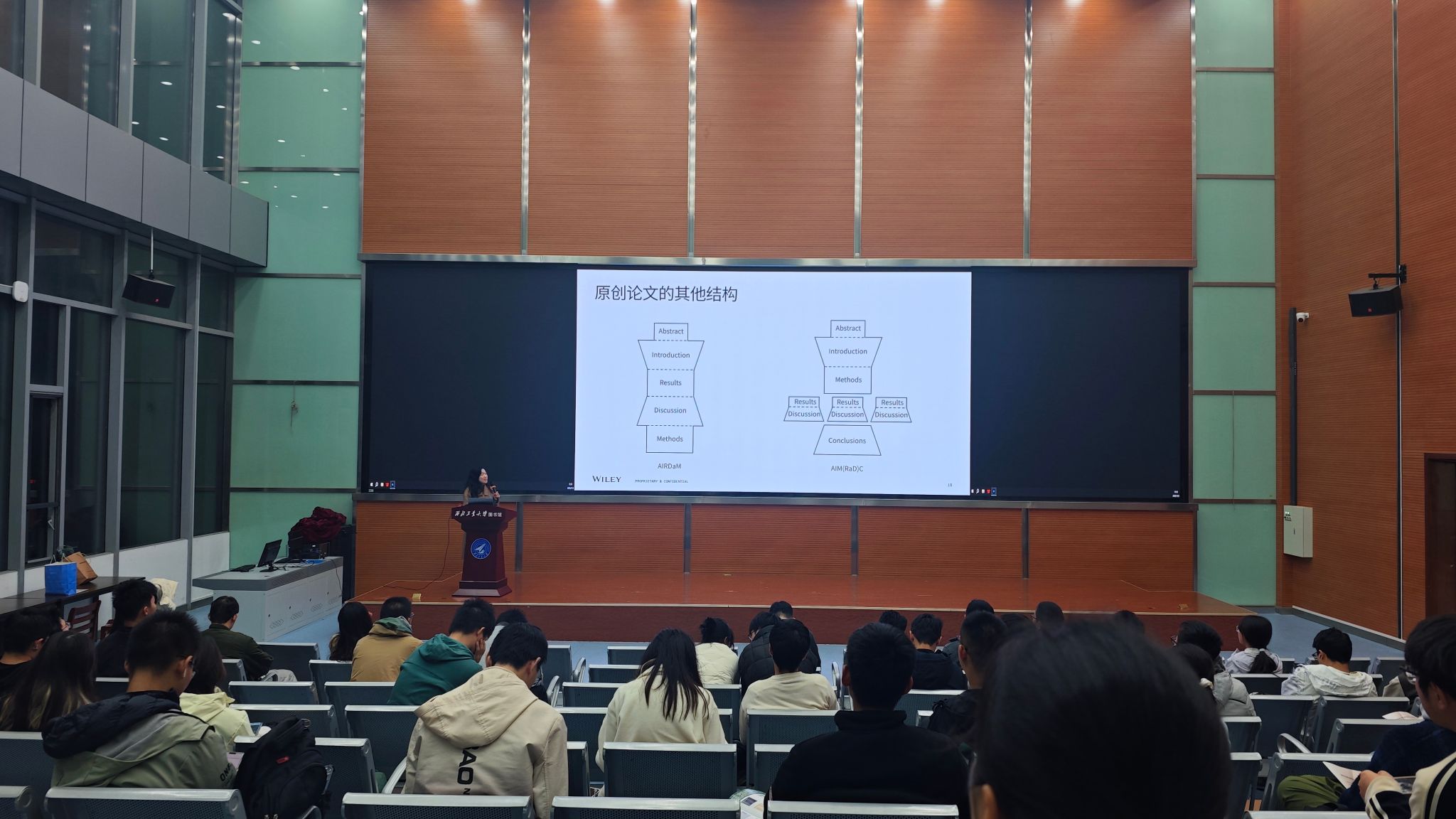 讲座特邀Wiley中国区市场部解决方案顾问丁楠老师担任主讲。丁老师围绕“从‘不敢写’到‘顺利投’:英文论文写作入门精讲”主题,系统讲解了英文论文写作与投稿的全流程。在掌握英文论文的“通用公式”部分,丁老师深入解析了IMRaD结构的叙事逻辑。她指出:“论文写作不仅是展示数据,更是构建一个环环相扣的科研故事。引言需清晰锚定研究价值,结果与讨论则要形成有力的证据链,直接回应核心科学问题。”随后,她围绕材料与方法、结果、讨论、创新性等模块,逐一剖析各部分的写作要点与常见误区,帮助学生建立规范、清晰的写作思维。在“导航投稿全流程”环节,丁老师从研究领域与创新点出发,讲解了期刊选择的策略,详细解析了同行评审流程的运作机制,以及如何专业、得体地撰写回复信,切实提升论文被接收的几率。此外,丁老师以Wiley数据库为例,现场演示了科研检索新范式,并分享了Wiley数据库实用检索技巧,助力同学们高效科研。