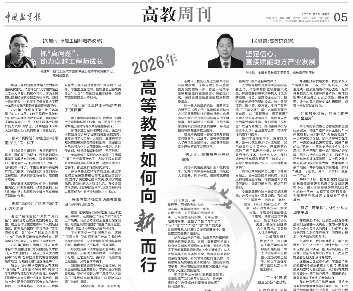 1月7日,《中国教育报》在“2026年高等教育如何向新而行”专题中,专访我院党委书记、常务副院长蒋建军。作为改革一线实践者,蒋建军书记围绕“抓‘真问题’,助力卓越工程师成长”主题,深入阐述了学院的改革路径与思考。
